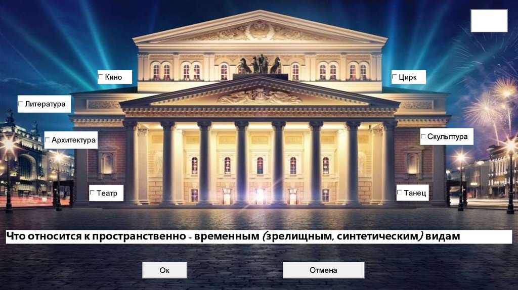 Что относится к пространственно - временным (зрелищным, синтетическим) видам