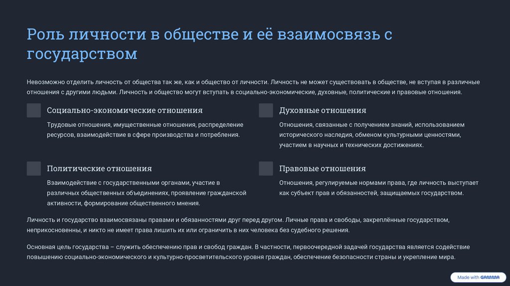 Личность и государство взаимосвязаны правами и обязанностями друг перед другом. Личные права и свободы, закреплённые государством,