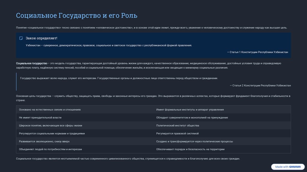 Социальное Государство и его РольПонятие «социальное государство» тесно связано с понятием «человеческое достоинство», и в основе этой идеи лежит, прежде всего, уважение к человеческому достоинству и служение народу как высшая цель.