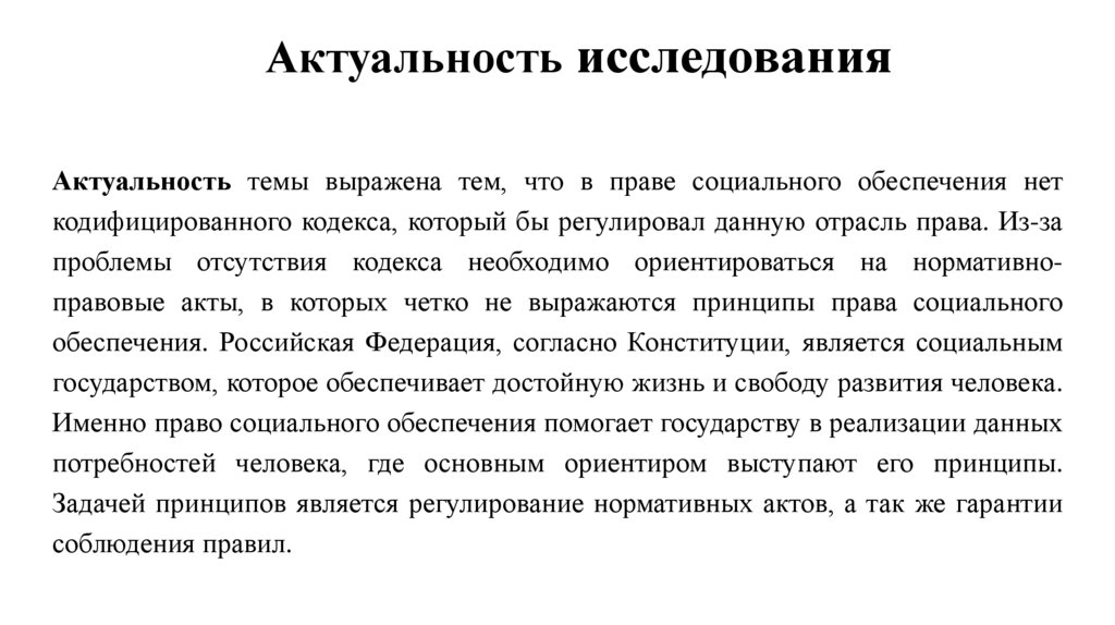 Актуальность темы выражена тем, что в праве социального обеспечения неткодифицированного кодекса, который бы регулировал данную отрасль права. Из-за