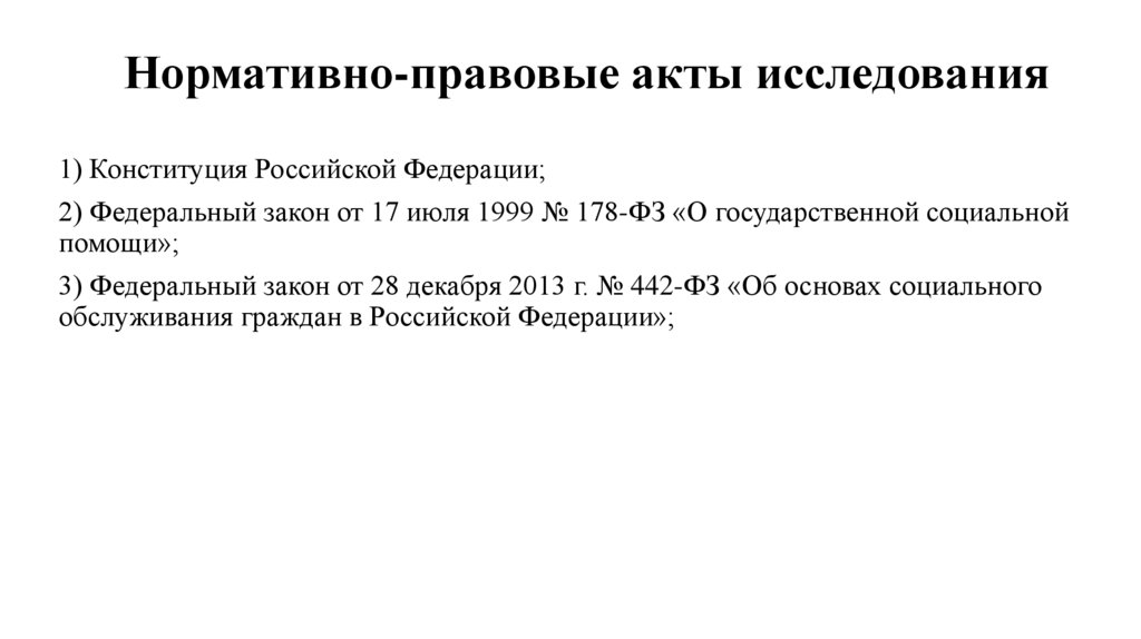 1) Конституция Российской Федерации;2) Федеральный закон от 17 июля 1999 № 178-ФЗ «О государственной социальной