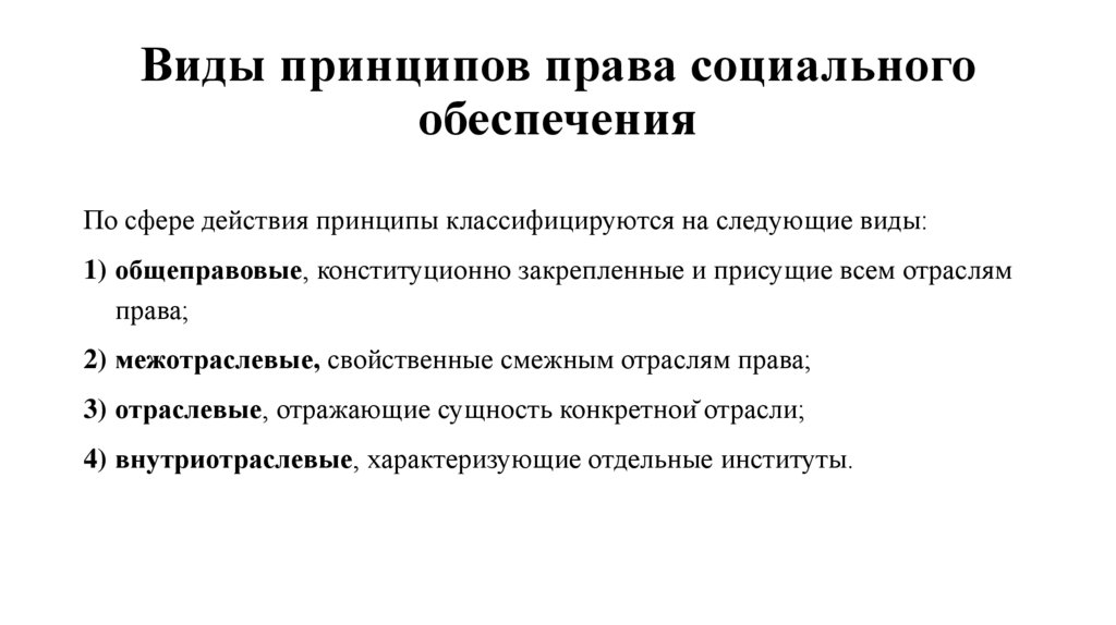 По сфере действия принципы классифицируются на следующие виды:1) общеправовые, конституционно закрепленные и присущие всем отраслям