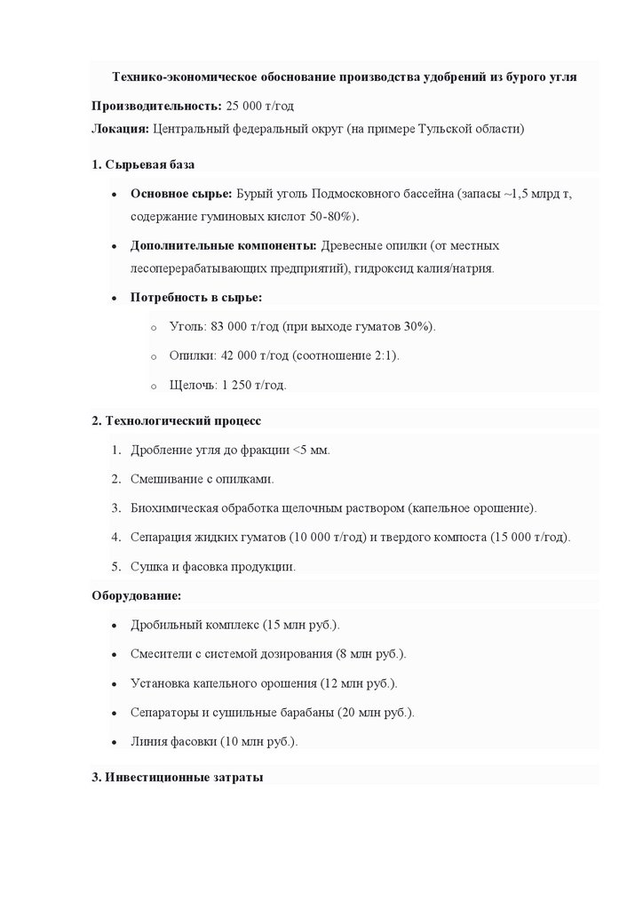 Технико-экономическое обоснование производства удобрений из бурого угляПроизводительность: 25 000 т/год