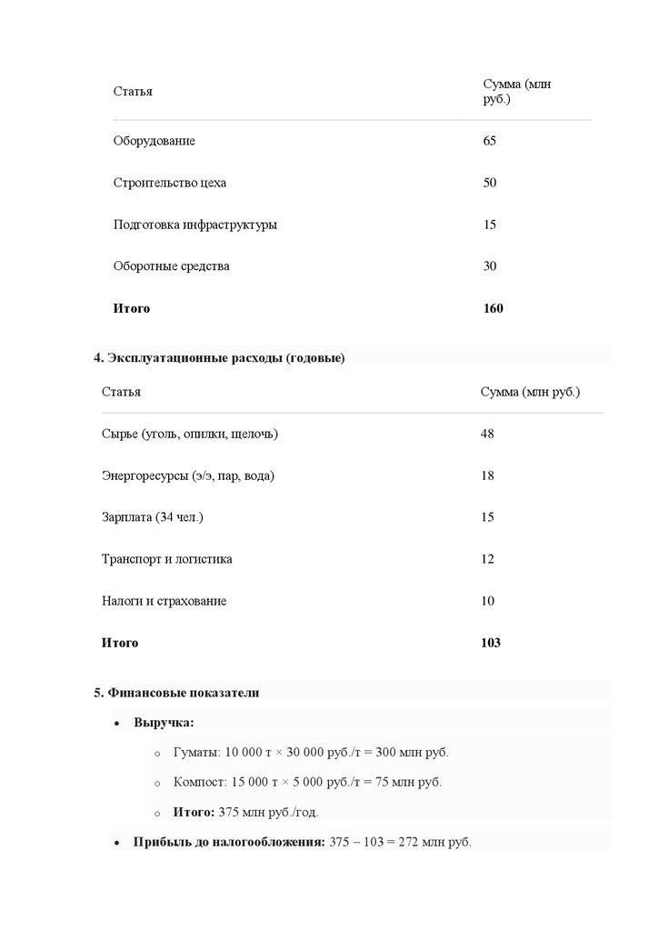 Уголь: 83 000 т/год (при выходе гуматов 30%).