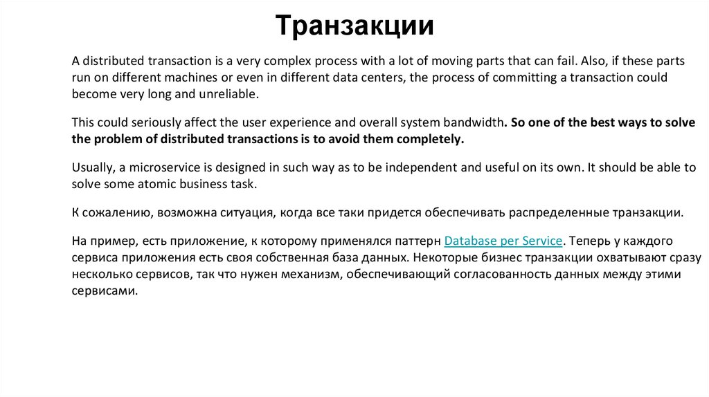 ТранзакцииA distributed transaction is a very complex process with a lot of moving parts that can fail. Also, if these parts