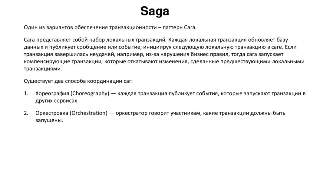 SagaОдин из вариантов обеспечения транзакционности – паттерн Сага.