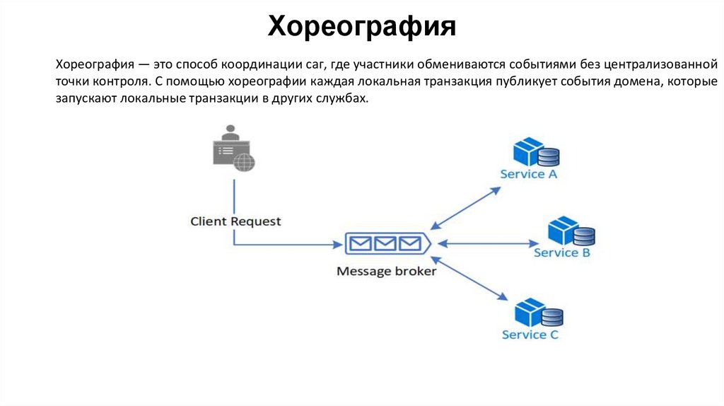 ХореографияХореография — это способ координации саг, где участники обмениваются событиями без централизованной