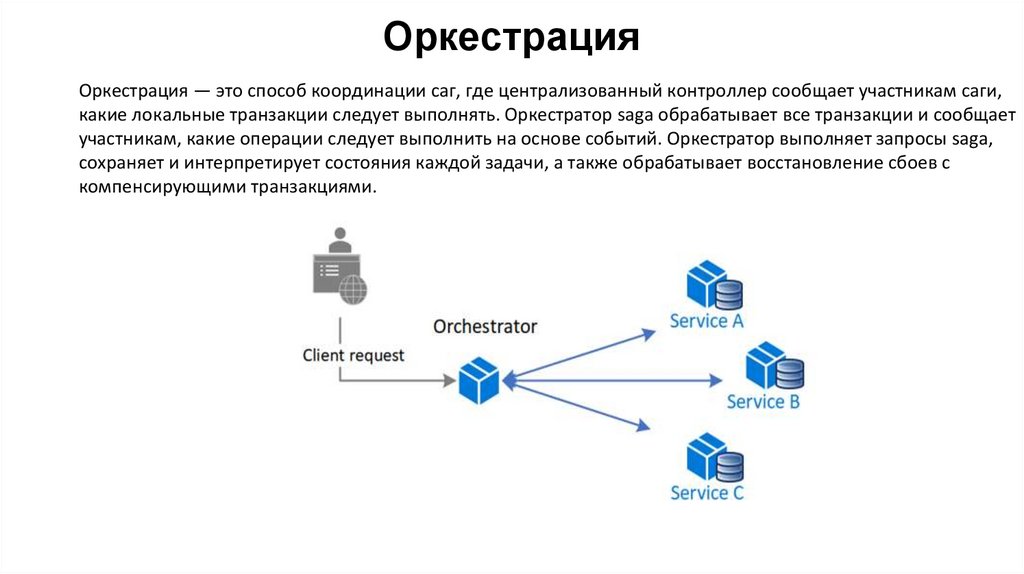 участникам, какие операции следует выполнить на основе событий. Оркестратор выполняет запросы saga,