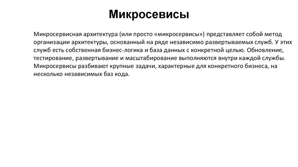 МикросевисыМикросервисная архитектура (или просто «микросервисы») представляет собой метод