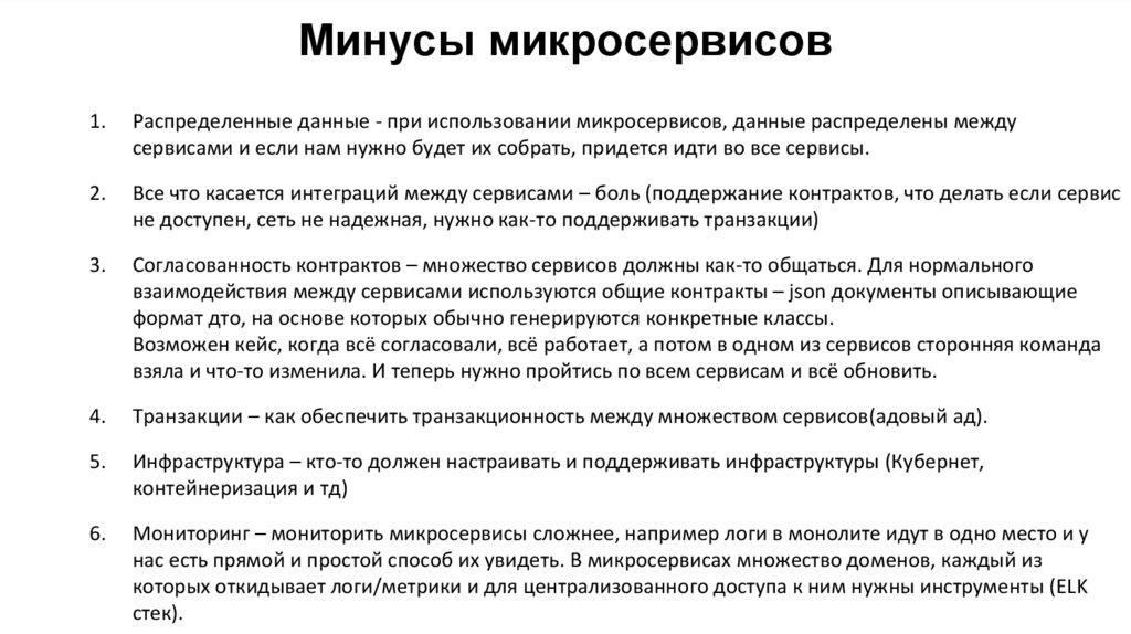 Все что касается интеграций между сервисами – боль (поддержание контрактов, что делать если сервис