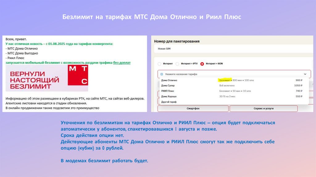 Безлимит на тарифах МТС Дома Отлично и Риил ПлюсУточнения по безлимитам на тарифах Отлично и РИИЛ Плюс – опция будет подключаться