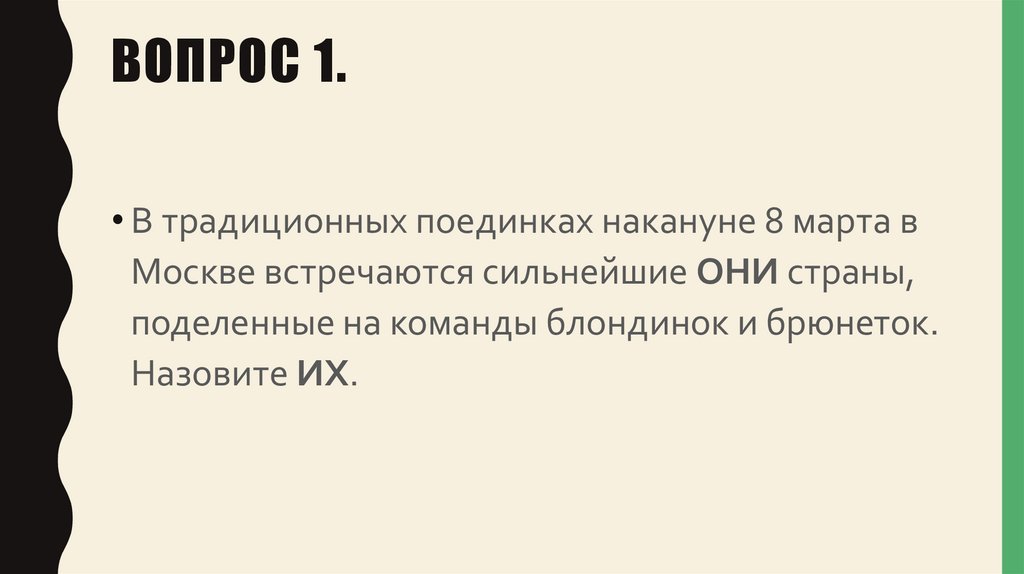 ВОПРОС 1.• В традиционных поединках накануне 8 марта в