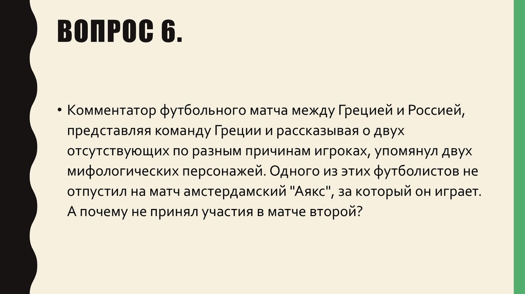 ВОПРОС 6.• Комментатор футбольного матча между Грецией и Россией,
