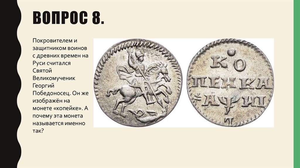 8. Святой Георгий держит в руках КОПЬЁ. Отсюда и «КОПЕЙКА».