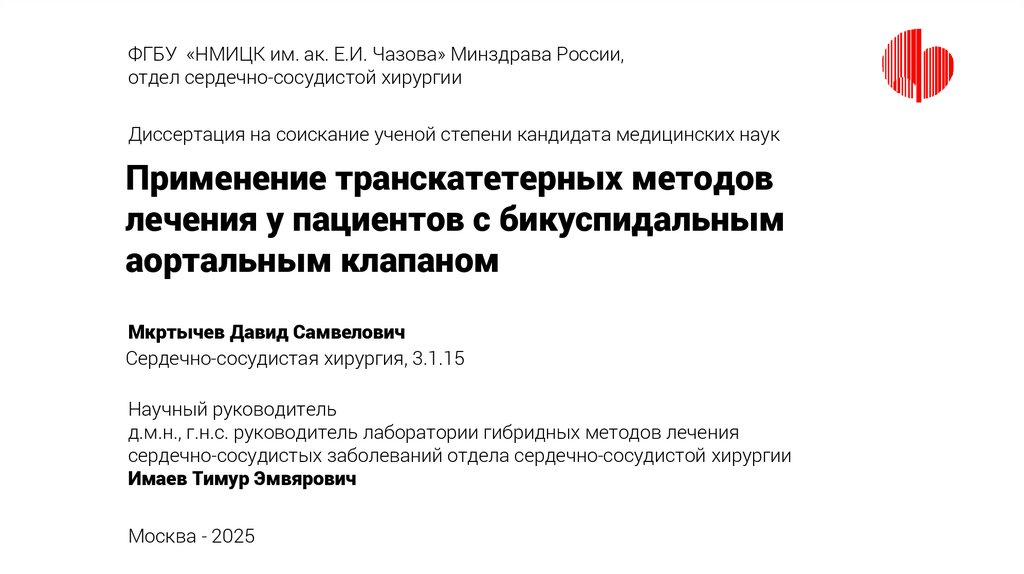 ФГБУ «НМИЦК им. ак. Е.И. Чазова» Минздрава России,отдел сердечно-сосудистой хирургии