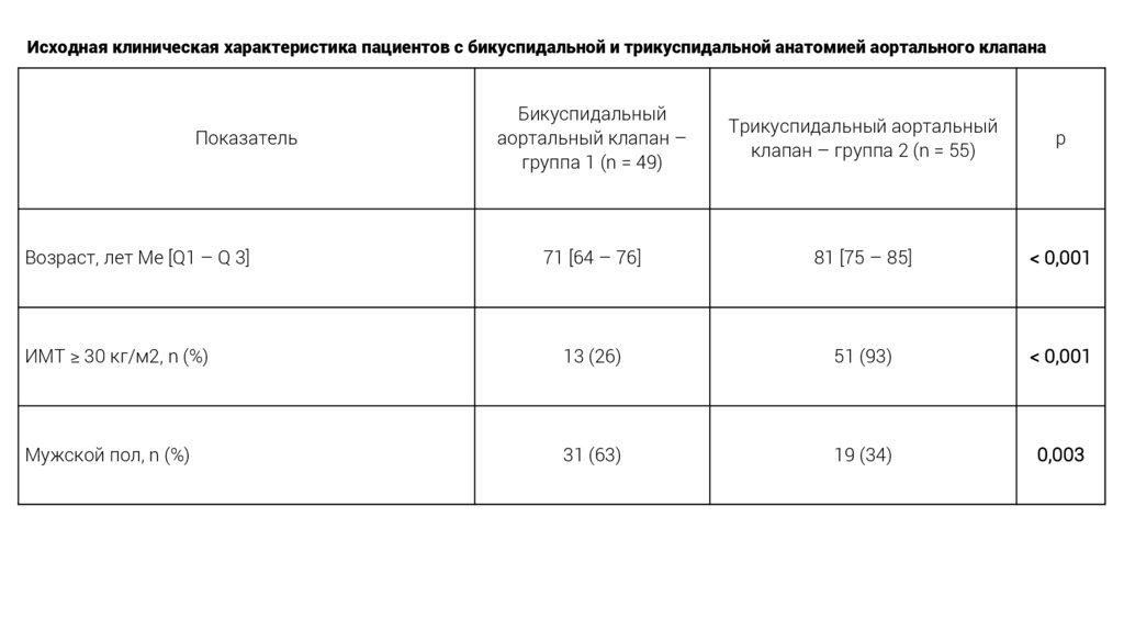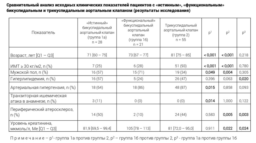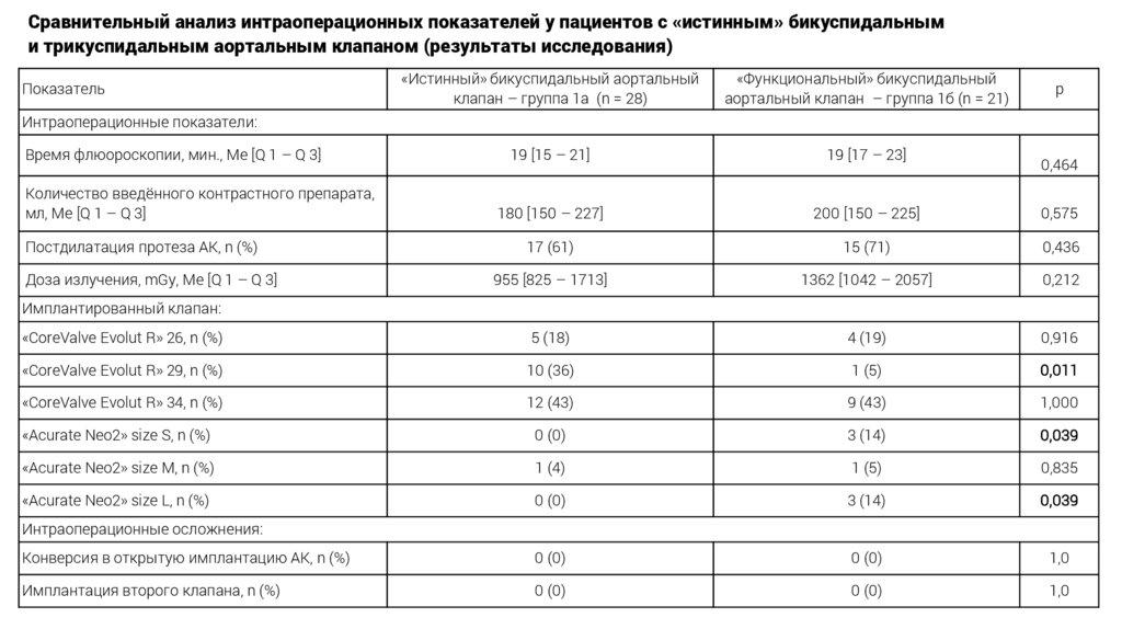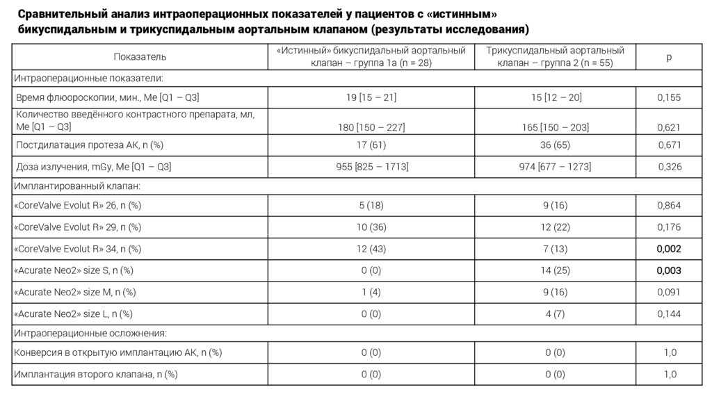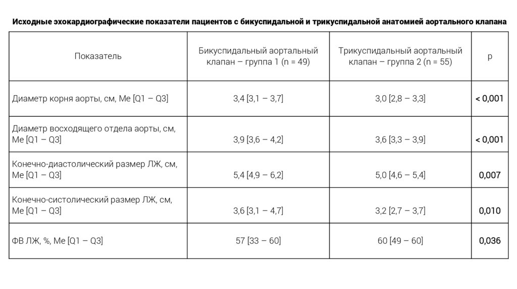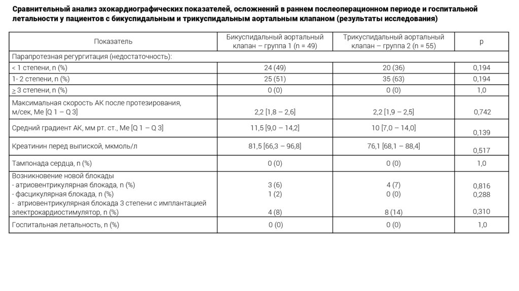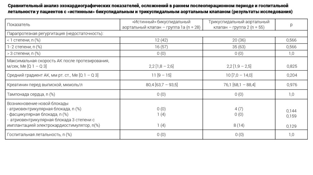 Сравнительный анализ эхокардиографических показателей, осложнений в раннем послеоперационном периоде и госпитальнойлетальности у пациентов с «истинным» бикуспидальным и трикуспидальным аортальным клапаном (результаты исследования)