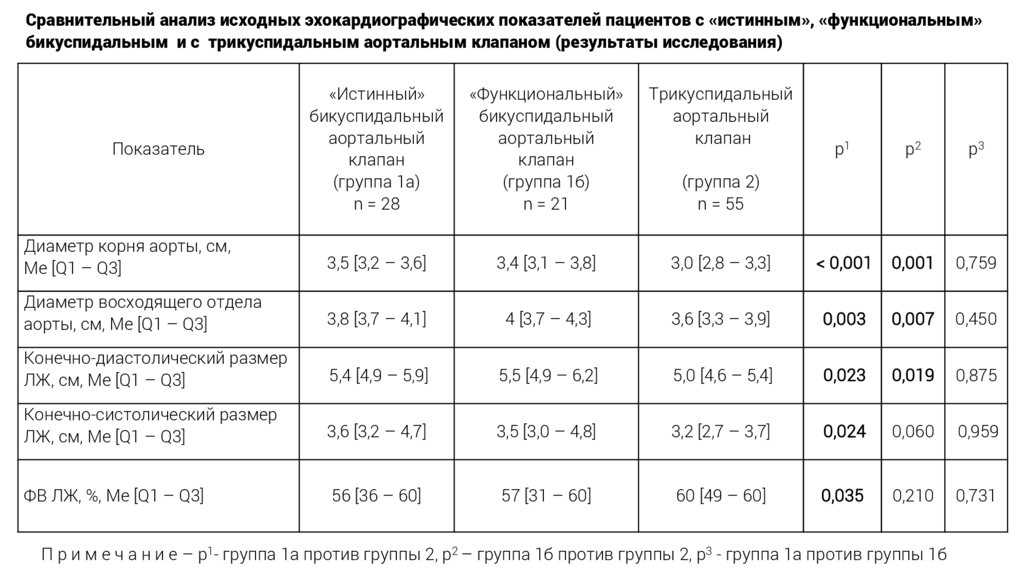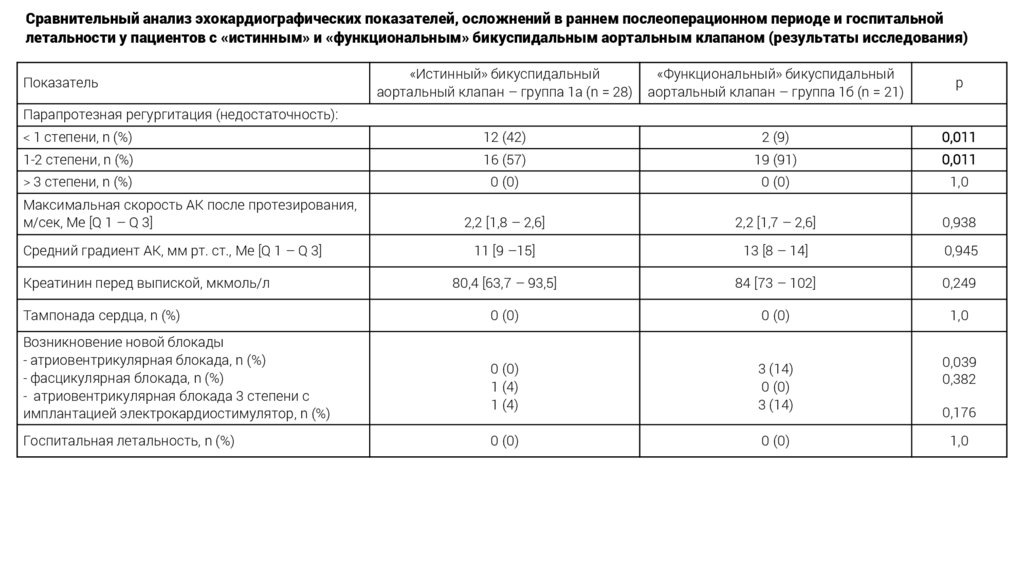 Сравнительный анализ эхокардиографических показателей, осложнений в раннем послеоперационном периоде и госпитальнойлетальности у пациентов с «истинным» и «функциональным» бикуспидальным аортальным клапаном (результаты исследования)
