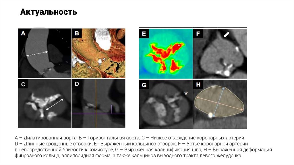 АктуальностьА – Дилатированная аорта, B – Горизонтальная аорта, С – Низкое отхождение коронарных артерий.