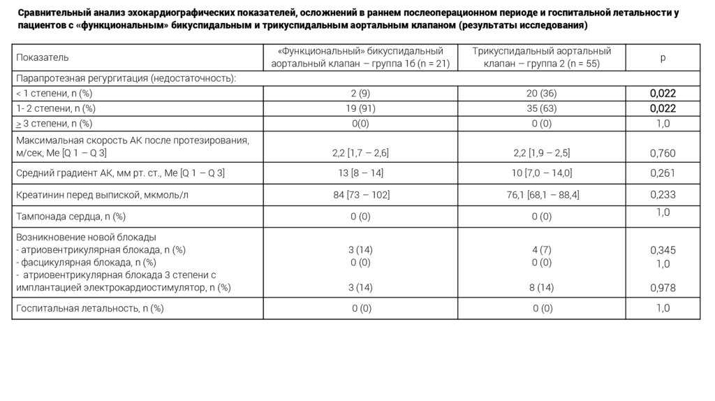 Сравнительный анализ эхокардиографических показателей, осложнений в раннем послеоперационном периоде и госпитальной летальности упациентов с «функциональным» бикуспидальным и трикуспидальным аортальным клапаном (результаты исследования)
