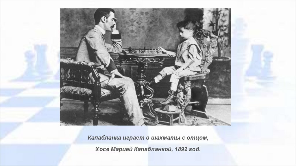 Капабланка играет в шахматы с отцом,Хосе Марией Капабланкой, 1892 год.