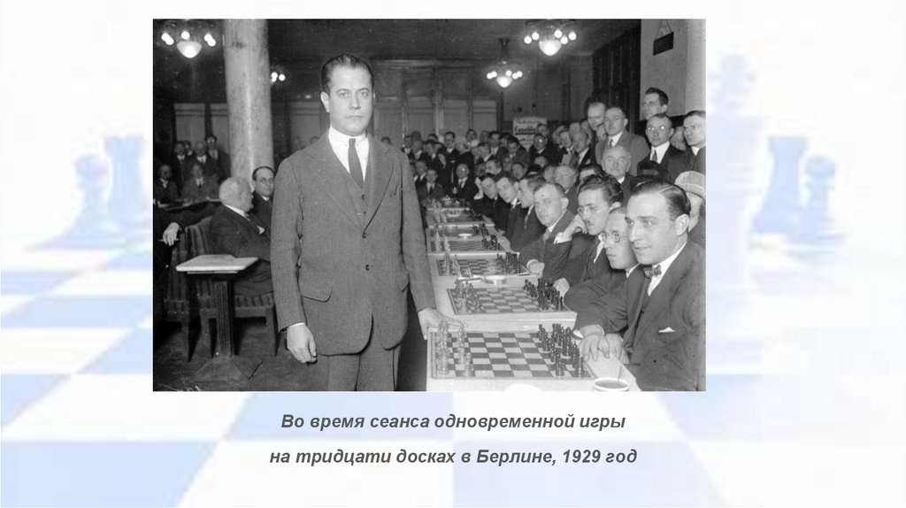 Во время сеанса одновременной игрына тридцати досках в Берлине, 1929 год