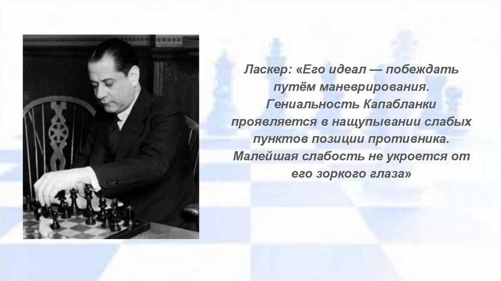 Ласкер: «Его идеал — побеждатьпутём маневрирования.