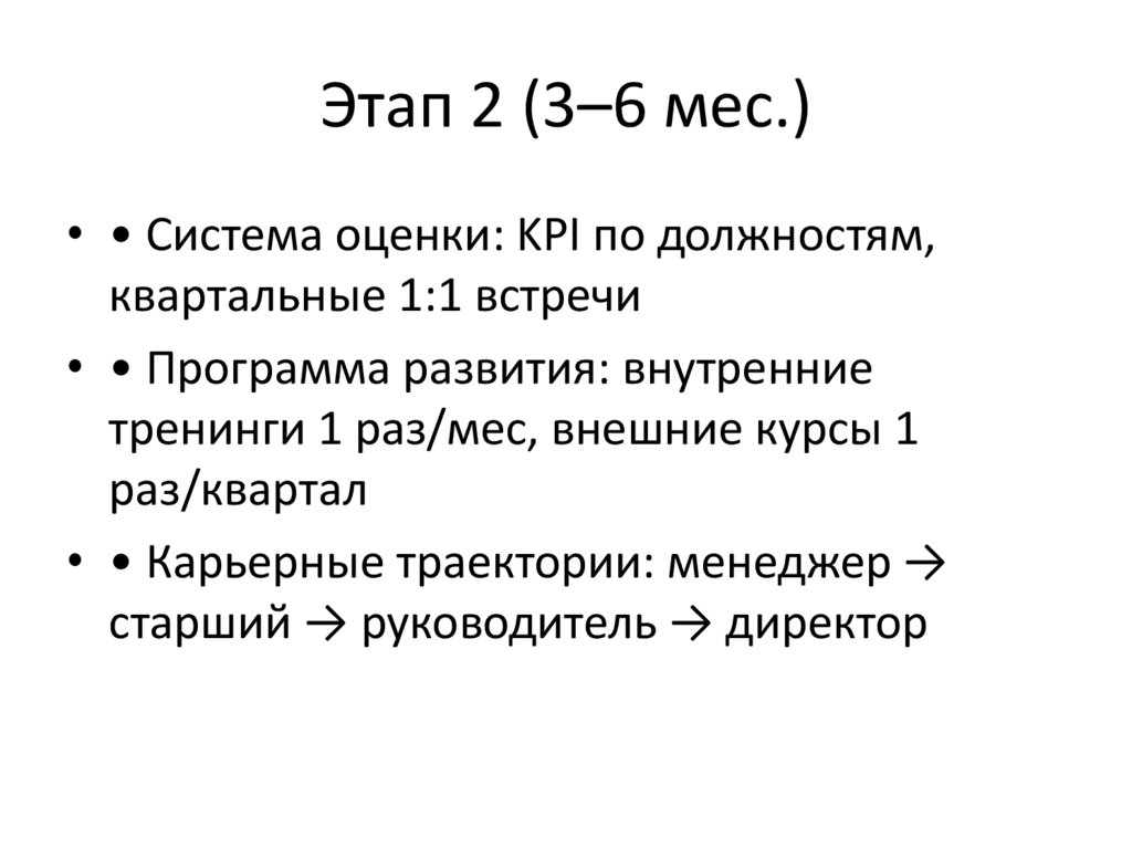 Этап 2 (3–6 мес.)• • Система оценки: KPI по должностям,