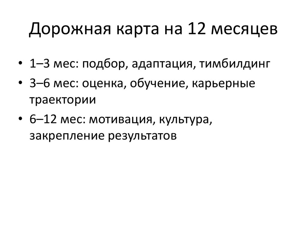 Дорожная карта на 12 месяцев• 1–3 мес: подбор, адаптация, тимбилдинг