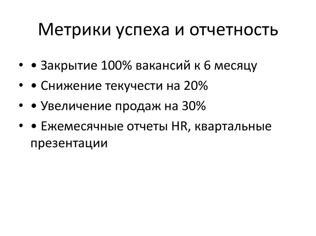 Метрики успеха и отчетность• • Закрытие 100% вакансий к 6 месяцу