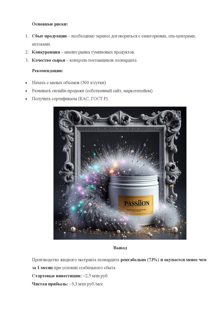 Основные риски:1. Сбыт продукции – необходимо заранее договориться с санаториями, спа-центрами,