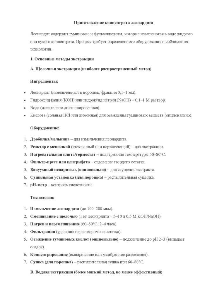 1. Измельчение леонардита (до 100–200 мкм).