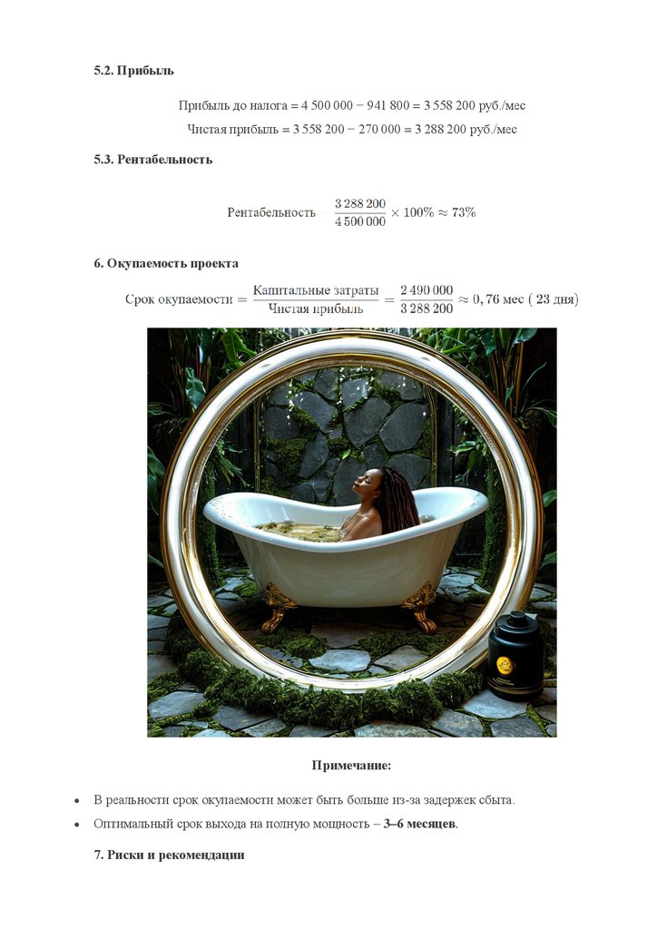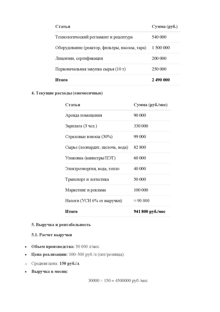 5.2. ПрибыльПрибыль до налога = 4 500 000 − 941 800 = 3 558 200 руб./мес