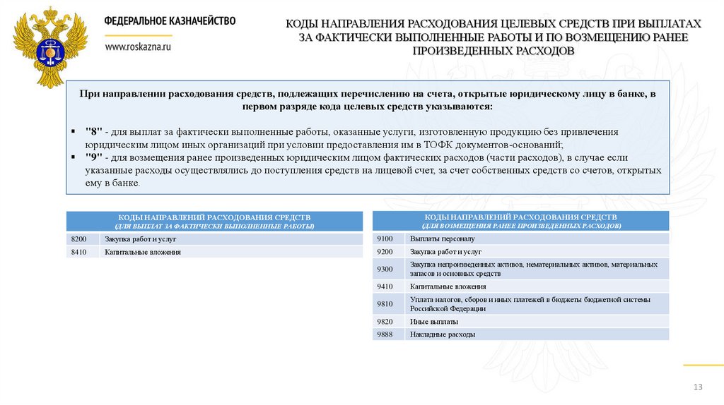 КОДЫ НАПРАВЛЕНИЯ РАСХОДОВАНИЯ ЦЕЛЕВЫХ СРЕДСТВ ПРИ ВЫПЛАТАХЗА ФАКТИЧЕСКИ ВЫПОЛНЕННЫЕ РАБОТЫ И ПО ВОЗМЕЩЕНИЮ РАНЕЕ