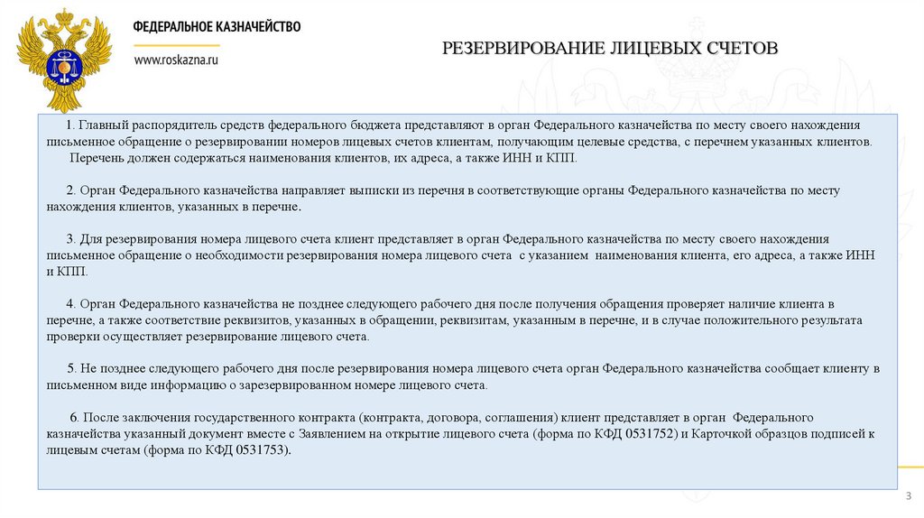 3. Для резервирования номера лицевого счета клиент представляет в орган Федерального казначейства по месту своего нахождения
