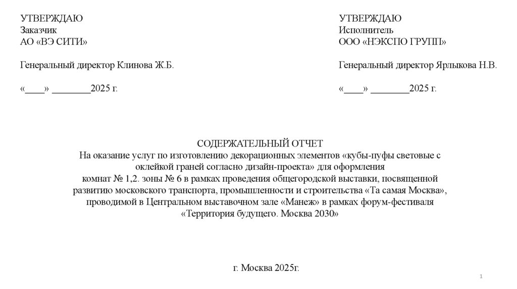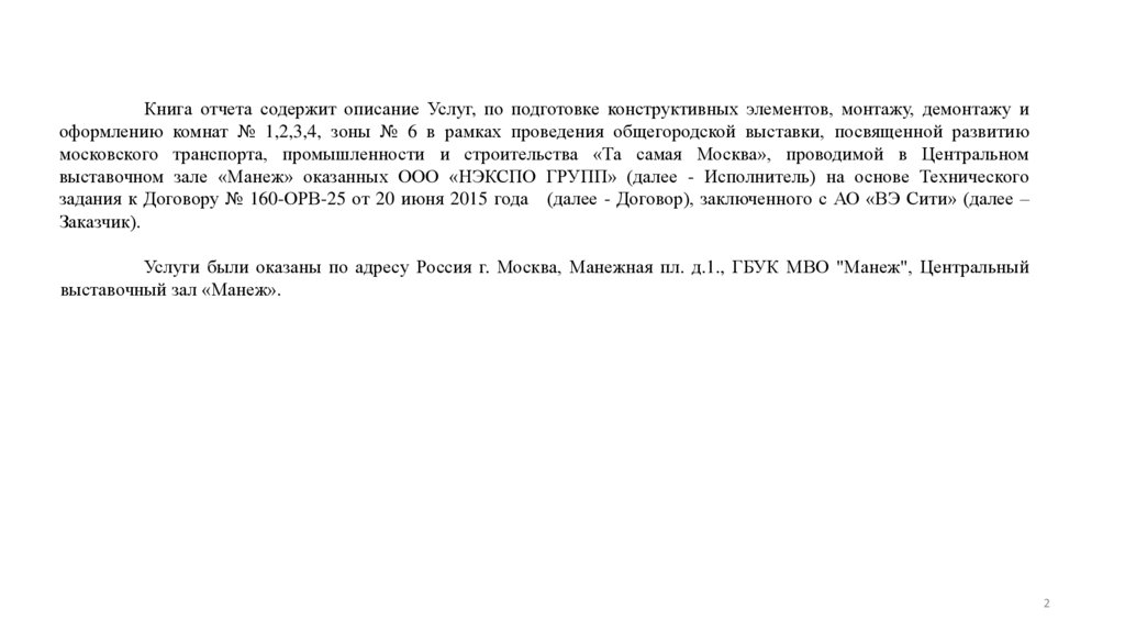 Книга отчета содержит описание Услуг, по подготовке конструктивных элементов, монтажу, демонтажу иоформлению комнат № 1,2,3,4, зоны № 6 в рамках проведения общегородской выставки, посвященной развитию