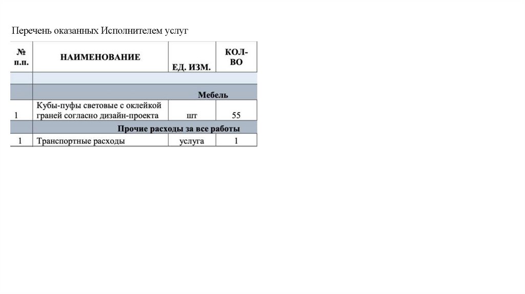 • Перечень оказанных Исполнителем услуг – стр. 4• Работы произведенные в Зоне 6 «Новый стандарт Развития Москвы» 1 этаж - стр. 5 - 59