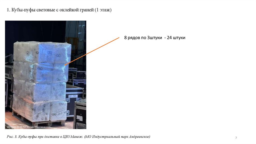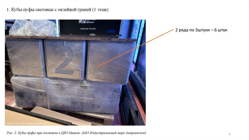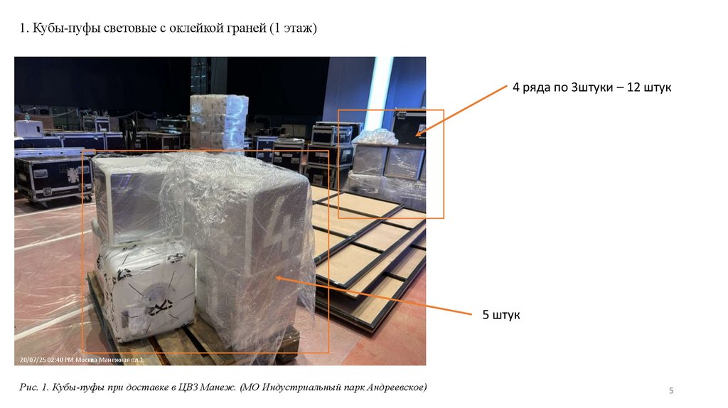 Рис. 3. Кубы-пуфы при доставке в ЦВЗ Манеж. (МО Индустриальный парк Андреевское)