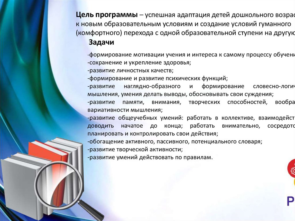 Цель программы – успешная адаптация детей дошкольного возраск новым образовательным условиям и создание условий гуманного