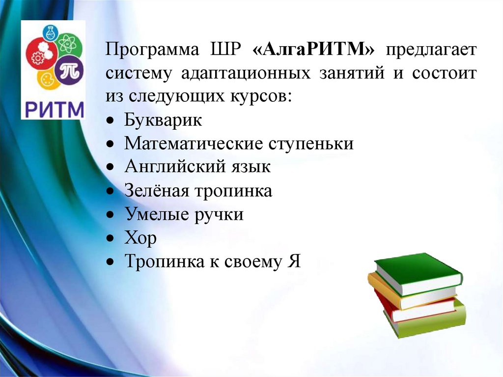 Программа ШР «АлгаРИТМ» предлагаетсистему адаптационных занятий и состоит
