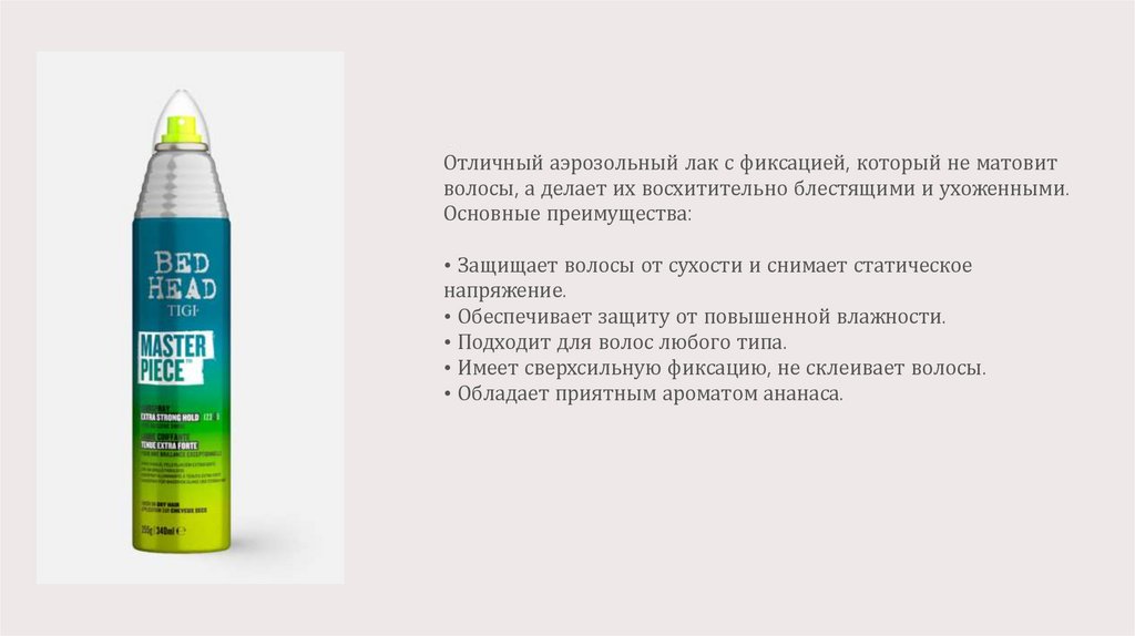 Отличный аэрозольный лак с фиксацией, который не матовитволосы, а делает их восхитительно блестящими и ухоженными.