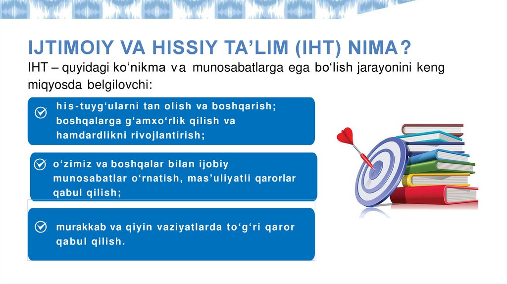 IJTIMOIY VA HISSIY TA’LIM (IHT) NIMA?IHT – quyidagi ko‘nikma v a munosabatlarga ega bo‘lish jarayonini keng