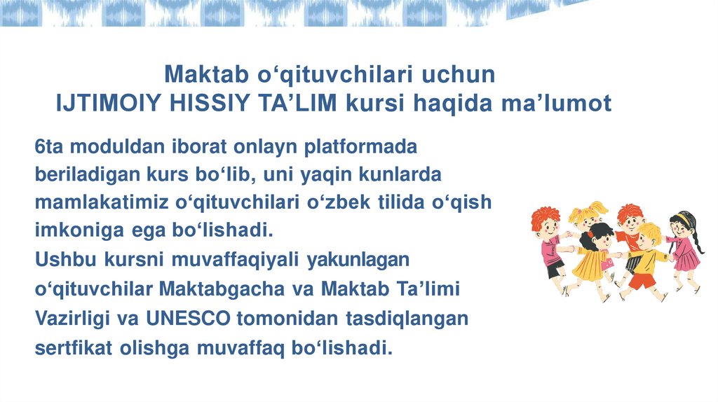 Maktab o‘qituvchilari uchunIJTIMOIY HISSIY TA’LIM kursi haqida ma’lumot