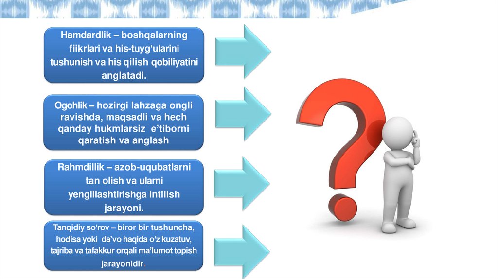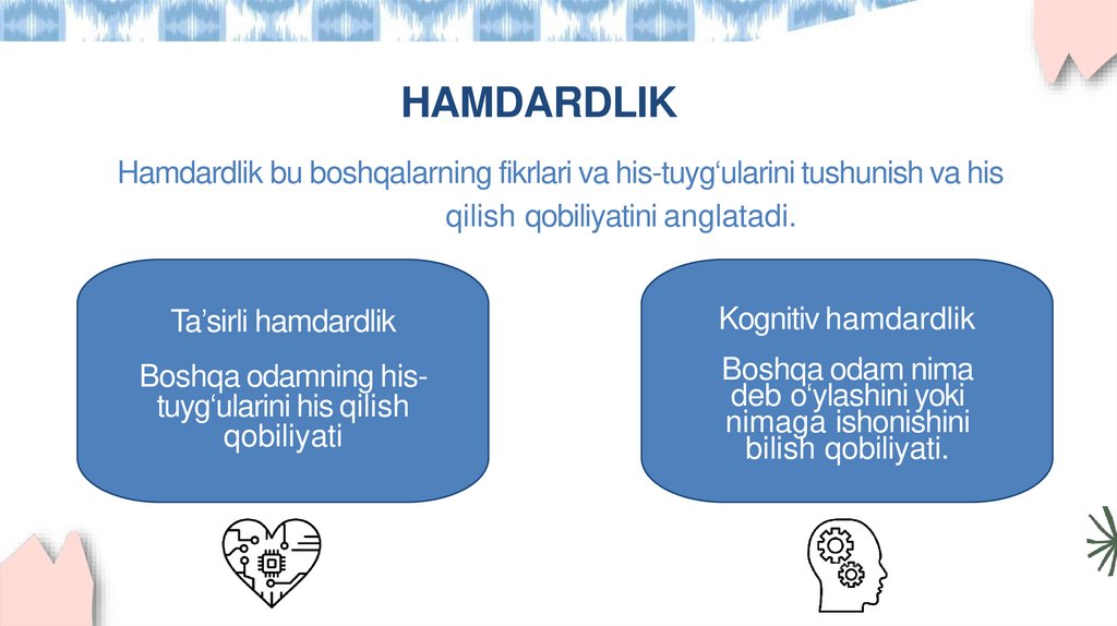HAMDARDLIKHamdardlik bu boshqalarning fikrlari va his-tuyg‘ularini tushunish va his