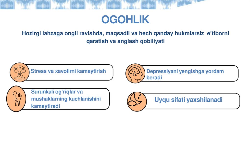 OGOHLIKHozirgi lahzaga ongli ravishda, maqsadli va hech qanday hukmlarsiz e’tiborni