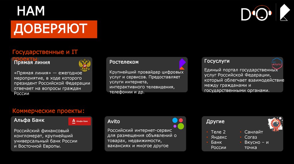 ЯНДЕКС, ТЕЛЕ2, HH.RU, SINLIGHT, СОГАЗ, АВИТО, И ДР.