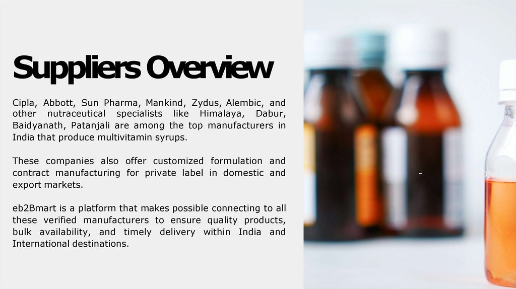 Suppliers OverviewCipla, Abbott, Sun Pharma, Mankind, Zydus, Alembic, and