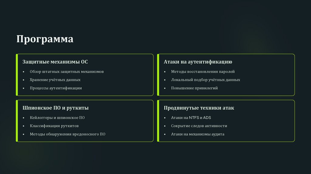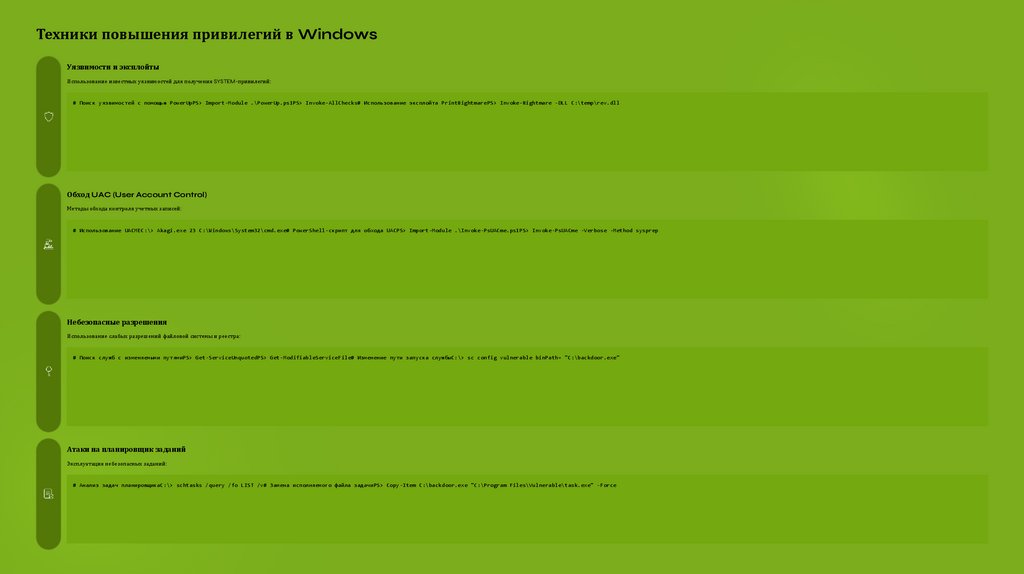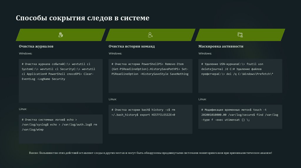 Важно: Большинство этих действий оставляют следы в других местах и могут быть обнаружены продвинутыми системами мониторинга или при криминалистическом анализе!