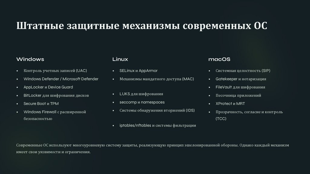 Современные ОС используют многоуровневую систему защиты, реализующую принцип эшелонированной обороны. Однако каждый механизм