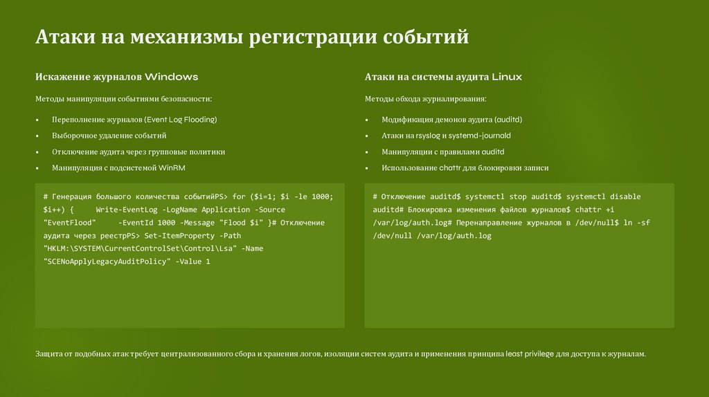 Защита от подобных атак требует централизованного сбора и хранения логов, изоляции систем аудита и применения принципа least privilege для доступа к журналам.