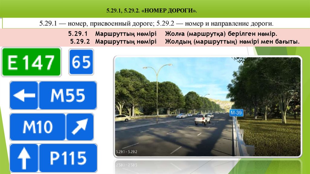 5.29.1, 5.29.2. «НОМЕР ДОРОГИ».5.29.1 — номер, присвоенный дороге; 5.29.2 — номер и направление дороги.